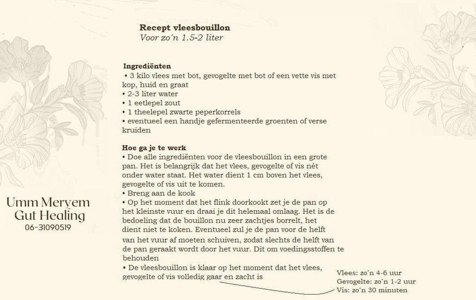 Ik heb verder een uitgebreide audio-les gemaakt over vleesbouillon, die is te vinden in mijn WhatsApp-groep (stuur me een berichtje voor de link. women only). In deze les wordt alles wat je over vleesbouillon moet weten uitgelegd.